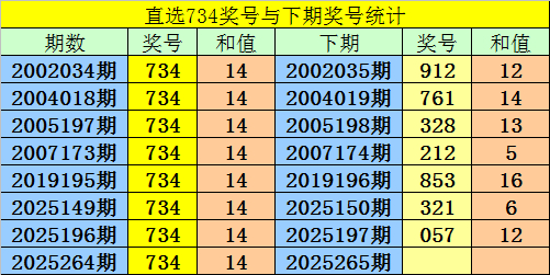 第2025264期3D奖号为:734,历史上该号码直选开出8次,下期号码分别为:912、761、328、212、853、321、057。